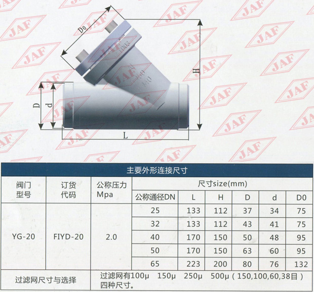 適用范圍 適用于公稱壓力為2.OMPa、公稱通徑為DN25~DN65閥體材料為鍛鋼的對(duì)焊直流過濾器?! ‘a(chǎn)品屬性 公稱壓力為2.OMPa,試驗(yàn)壓力為3.OMPa,適用溫度為-50°C-+200°C適用介質(zhì)為氨、氟等?! I表示過濾器 Y表示結(jié)構(gòu)形式為直流式 D表示對(duì)焊連接 20代表公稱壓力為2.OMPa 20后不標(biāo)注表示殼體材質(zhì)為鍛鋼。